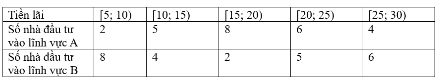 Người ta ghi lại tiền lãi (đơn vị: triệu đồng) của một số nhà đầu tư (với số tiền đầu tư như nhau), khi đầu tư vào hai lĩnh vực A, B cho kết quả như sau: